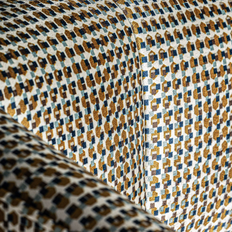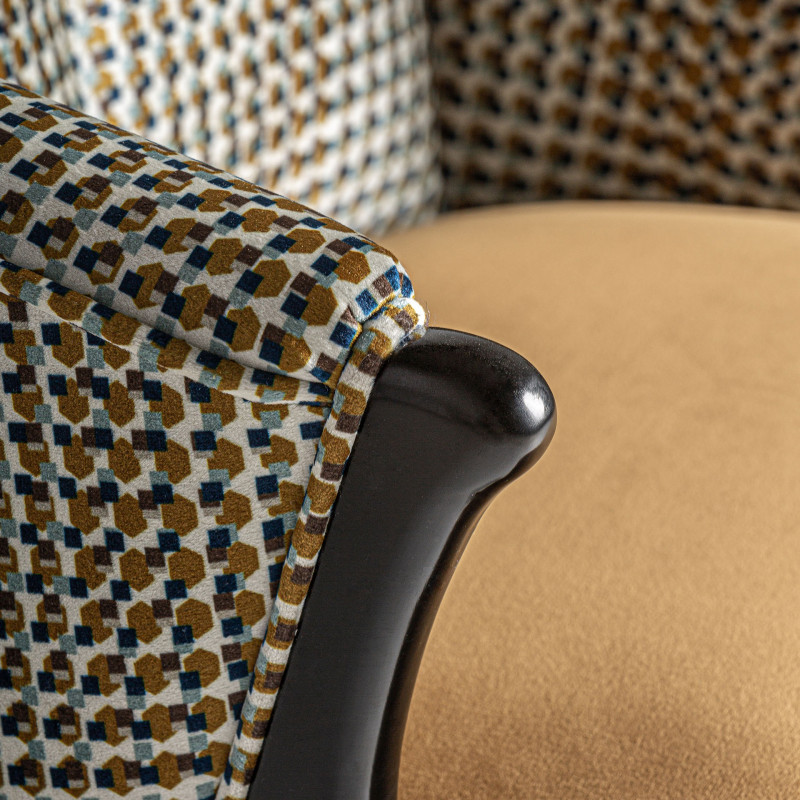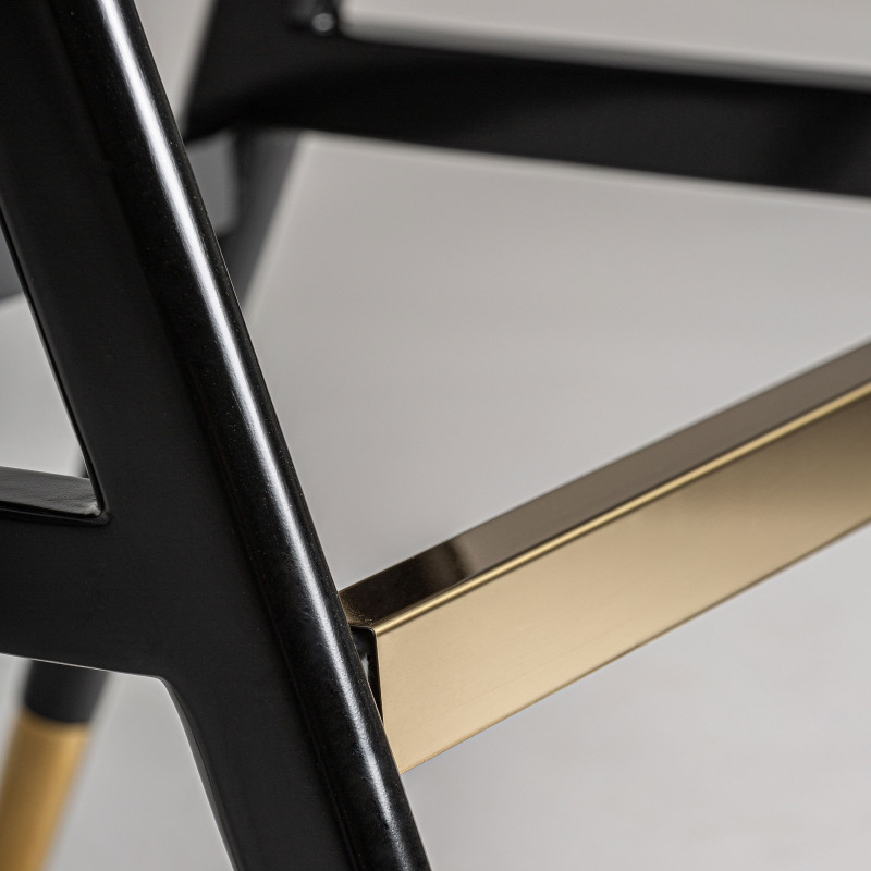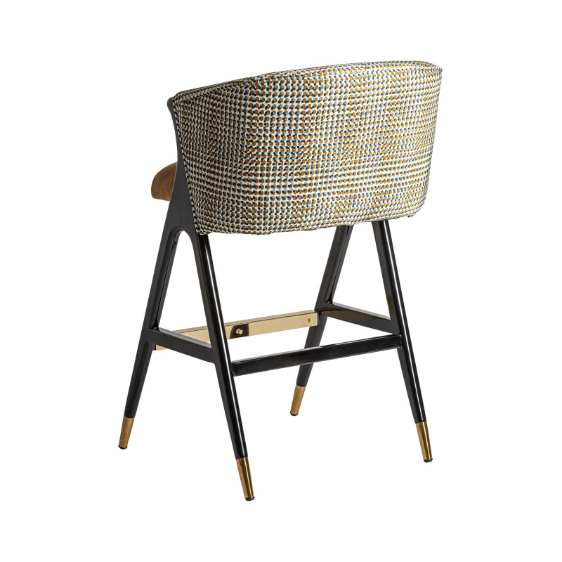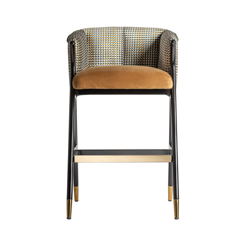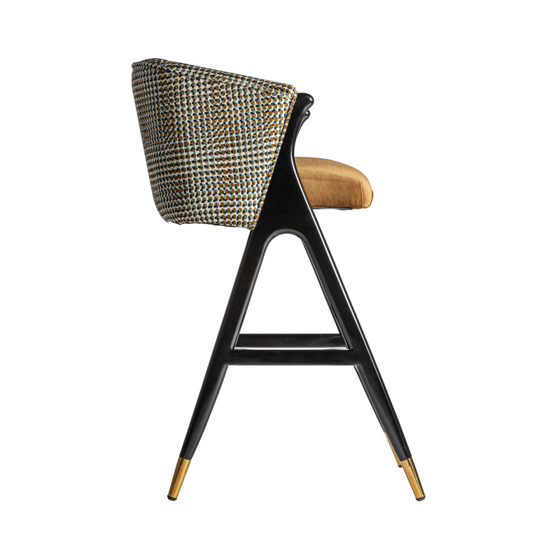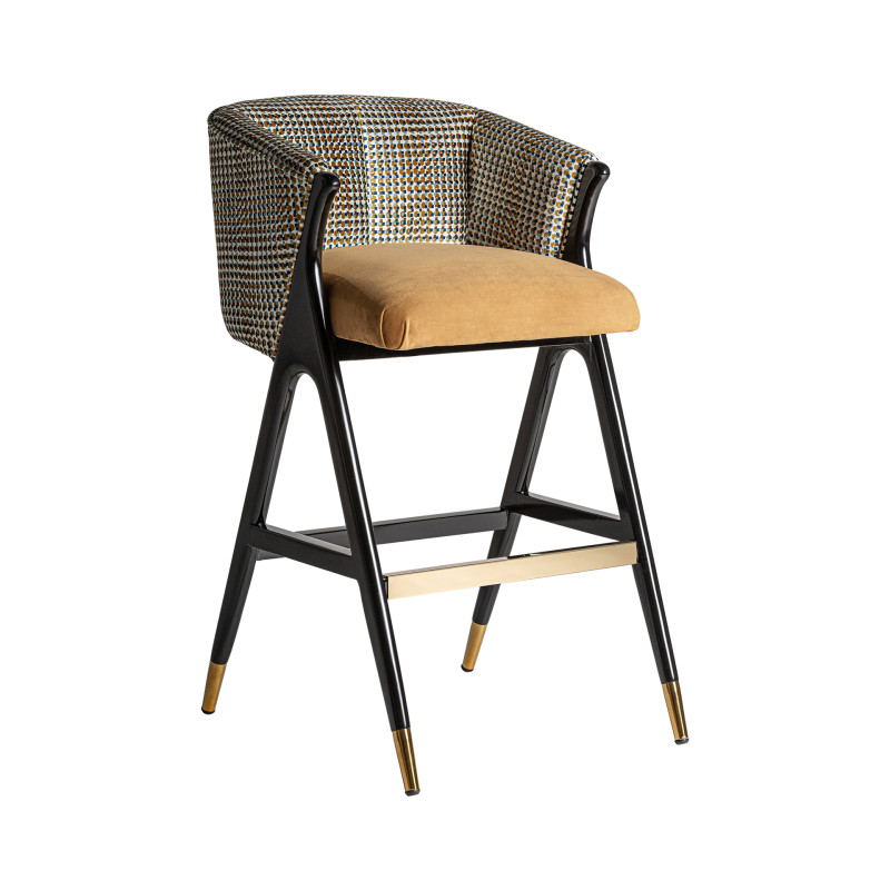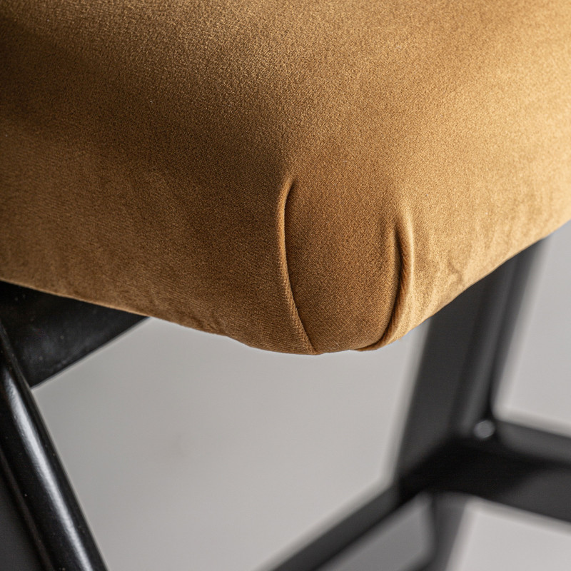 Taburete brillon en color ocre de estilo art deco. Fabricado en madera de caucho combinado con acero y terciopelo.
