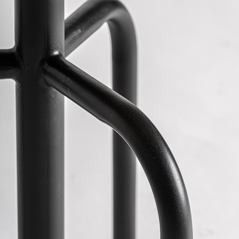 Taburete snait de estilo vintage fabricado en hierro en color negro combinado con cuero cabra en color marron y espuma.