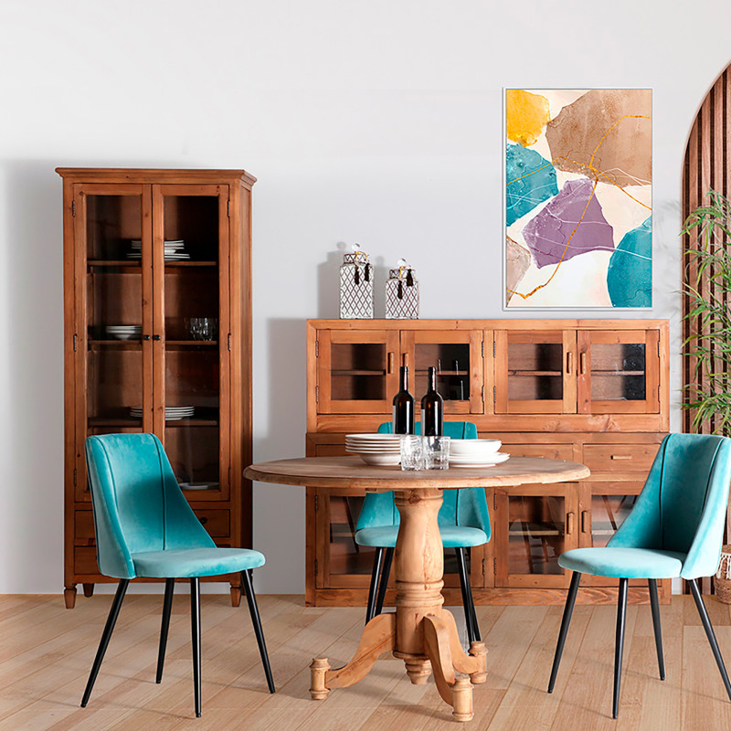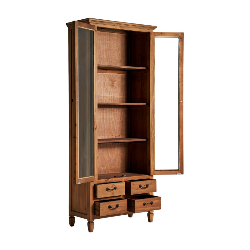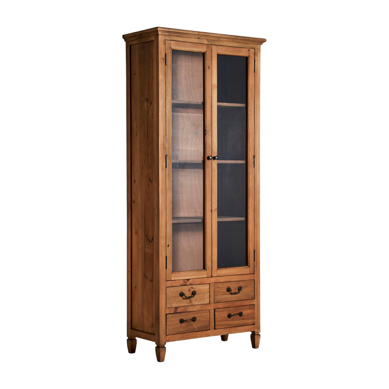 Vitrina mens, en color natural, de estilo colonial. Fabricado en madera de pino, combinado con vidrio.
